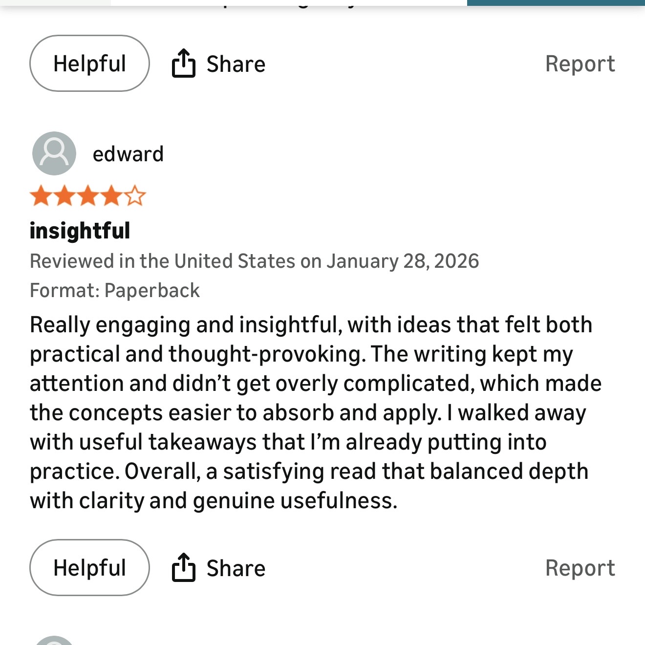 “Really engaging and insightful, with ideas that felt both practical and thought-provoking. The writing kept my attention and didn’t get overly complicated, which made the concepts easier to absorb and apply. I walked away with useful takeaways that I’m already putting into practice….”