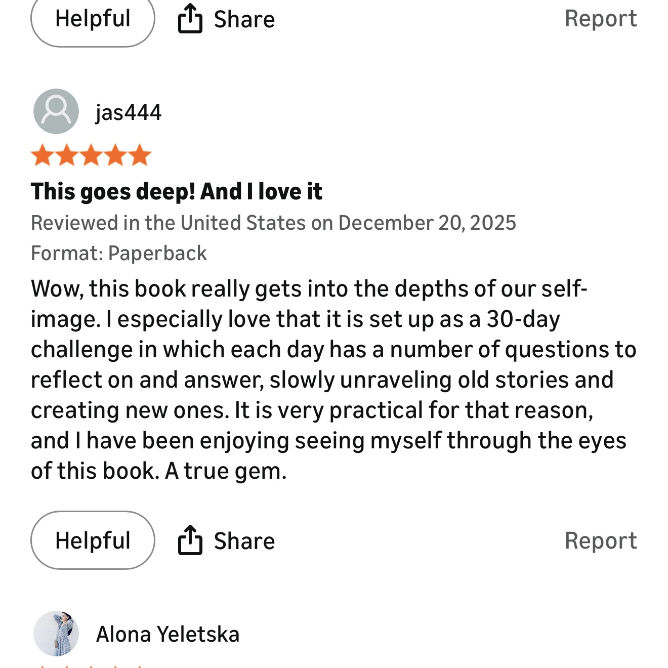 “Wow, this book really gets into the depths of our self-image. I especially love that it is set up as a 30-day challenge in which each day has a number of questions to reflect on and answer, slowly unraveling old stories and creating new ones. It is very practical for that reason, and I have been enjoying seeing myself through the eyes of this book. A true gem.”