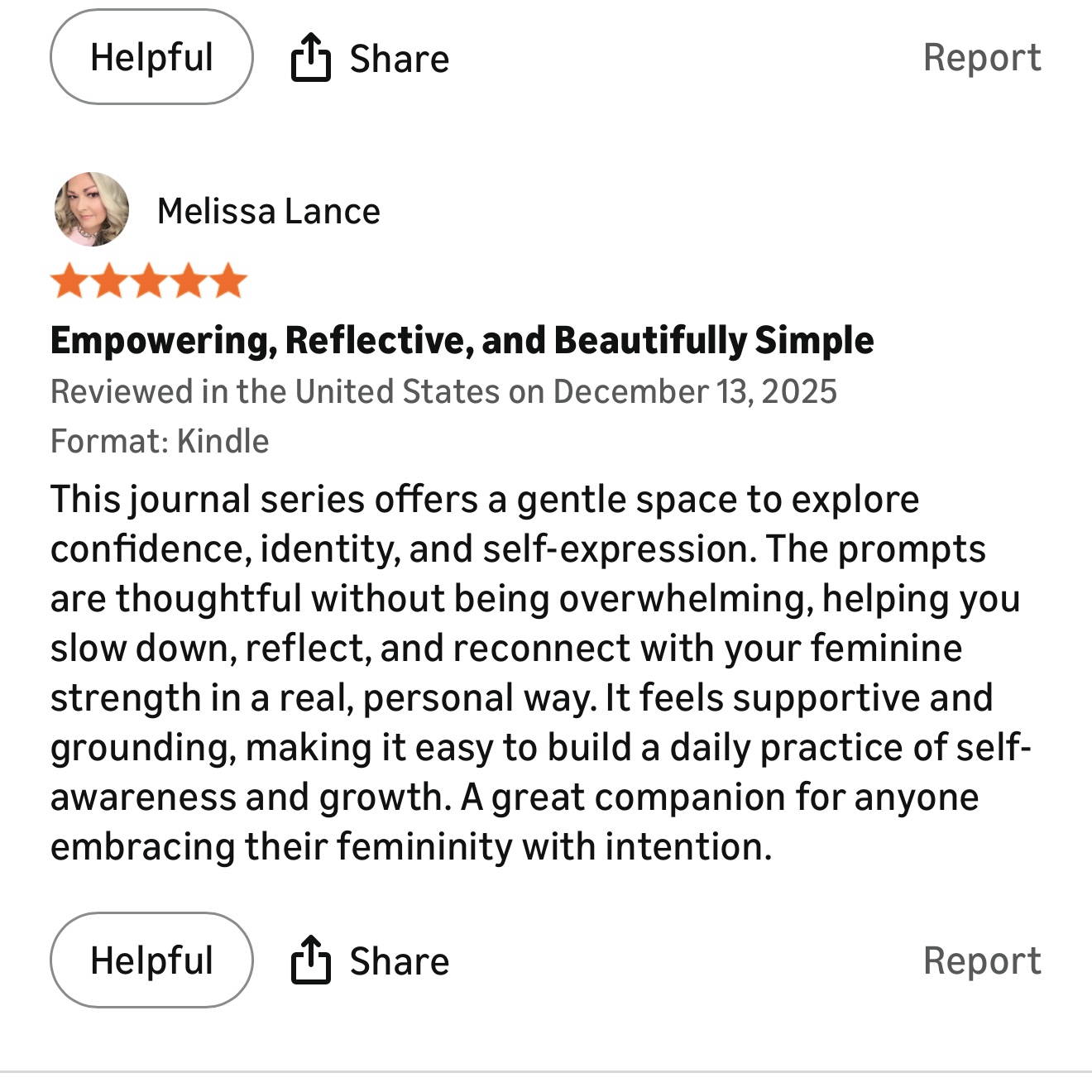 “A gentle space to explore confidence, identity, and self-expression. The prompts are thoughtful without being overwhelming, helping you slow down, reflect, and reconnect with your feminine strength in a real, personal way… A great companion for anyone embracing their femininity with intention.”