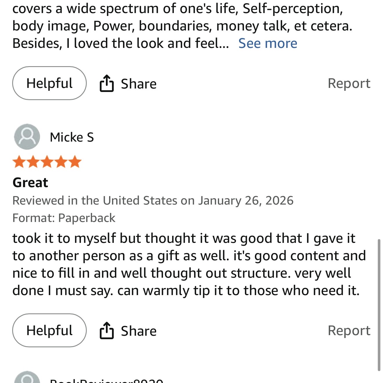 “took it to myself but thought it was good that I gave it to another person as a gift as well. it’s good content and nice to fill in and well thought out structure. very well done I must say. can warmly tip it to those who need it.”