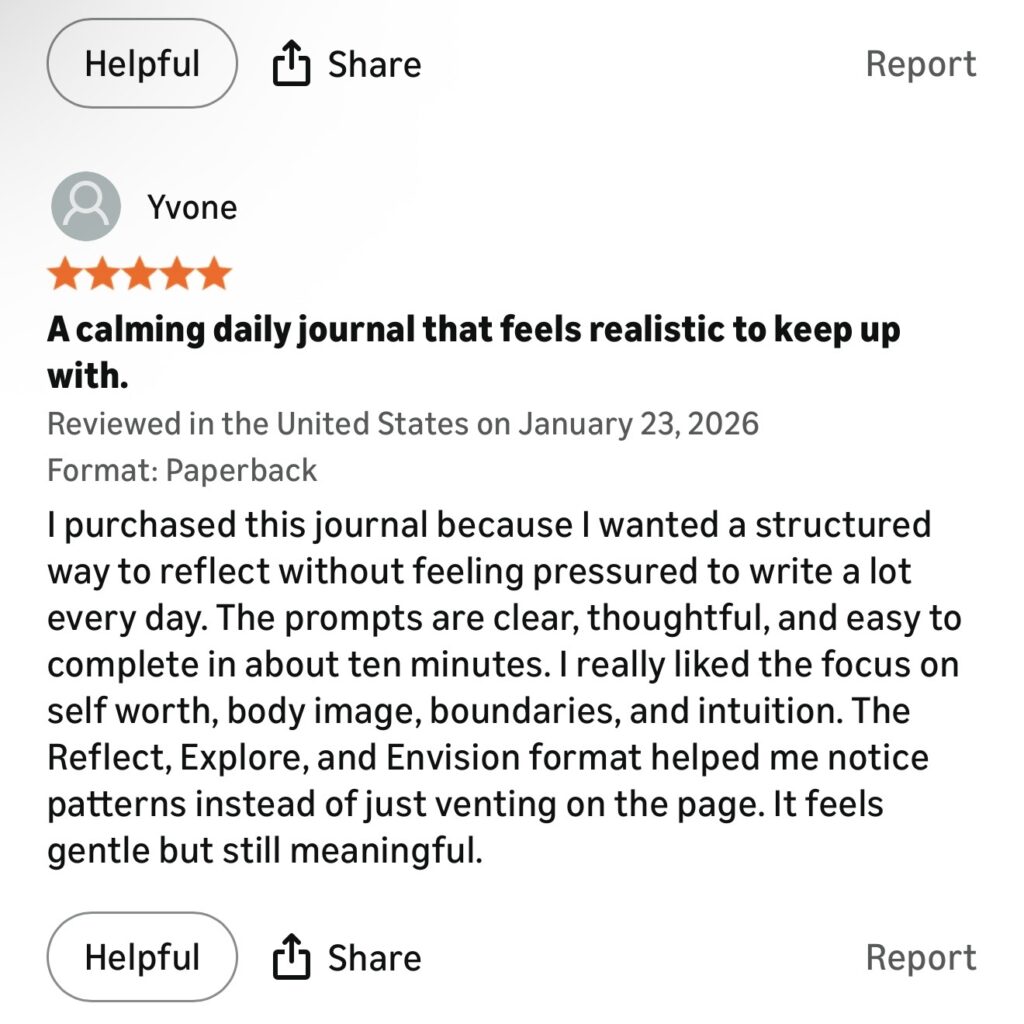 "...The prompts are clear, thoughtful, and easy to complete in about ten minutes. I really liked the focus on self worth, body image, boundaries, and intuition. The Reflect, Explore, and Envision format helped me notice patterns instead of just venting on the page....